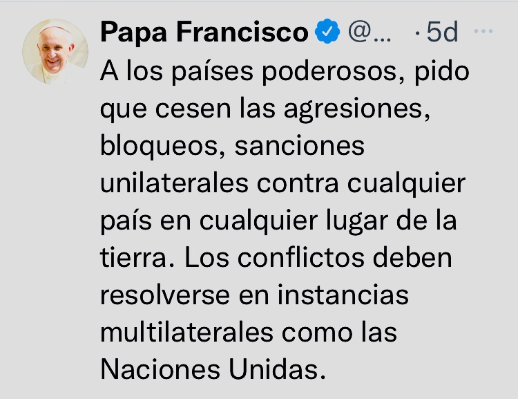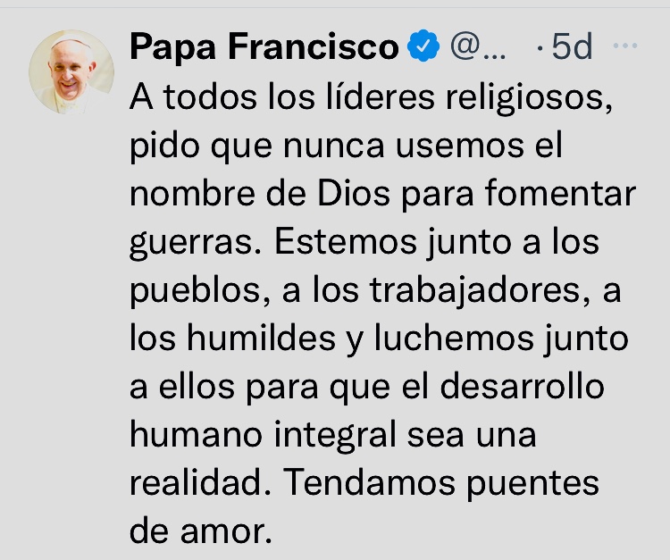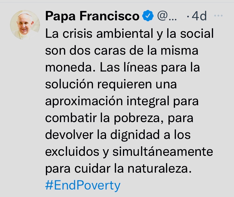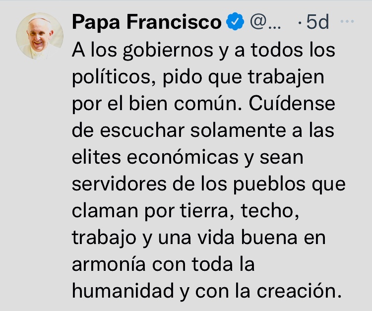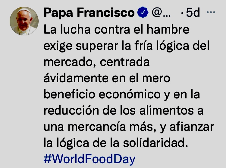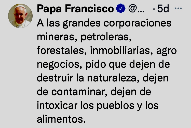 Francisco, el Papa resiliente, pasará a la historia por su singular desenfado y por su desempeño en las redes sociales. Su presencia activa en Twitter, con la destreza de un nativo digital, nos regala a menudo momentos memorables. Como los tuits escritos a mitad de este octubre, con mensajes punzantes a los depredadores de la política, la naturaleza, la verdad y la vida… Esos reclamos en nombre de Dios (recopilados en esta entrada de Mojito News) también motivan estas reflexiones.
